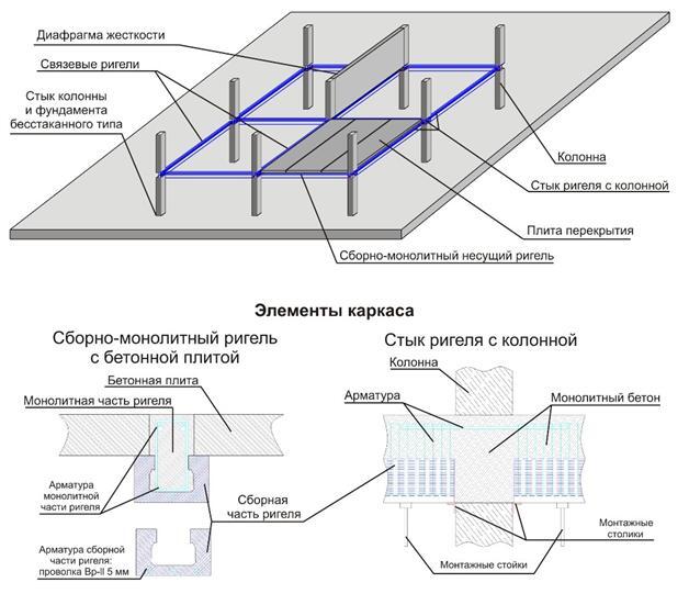 Сборно-монолитный каркас зданий состоит из сборных железобетонных колонн и плит перекрытия, объединенных с колоннами сборно-монолитными ригелями. Применение данного каркаса позволяет обеспечить возможность свободной планировки, а учитывая нашу технологию в производстве плит перекрытия ПБ длинною до 10,8м, а деталей ригеля ДР до 7,0м, можно говорить о широком применении сборно-монолитного каркаса при строительстве жилых, общественных и промышленных зданий.